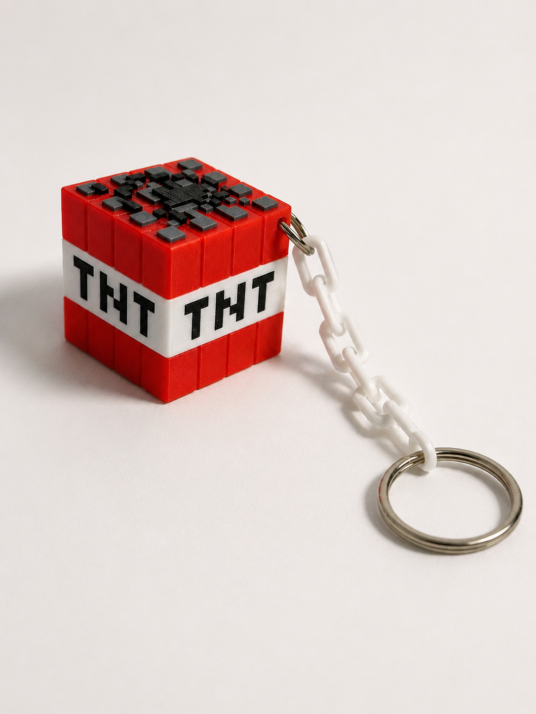 Inspirado no icónico bloco TNT do universo pixelado, este Porta-Chaves TNT Minecraft 3D é o acessório perfeito para qualquer fã de jogos.